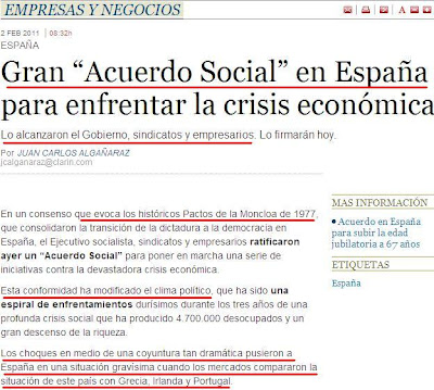 Véase la sutil tergiversación de los hechos ejecutada por el periodista: de resultas de la lectura del artículo uno extrae como conclusión que la crsisis económica fue causada por los "choques políticos" y no por la adhesión de España a un modelo económico que la puso más que de rodillas, como a Grecia, Irlanda y Portugal. Poner el carro delante de los caballos, así decían los paisanos de mi pueblo.